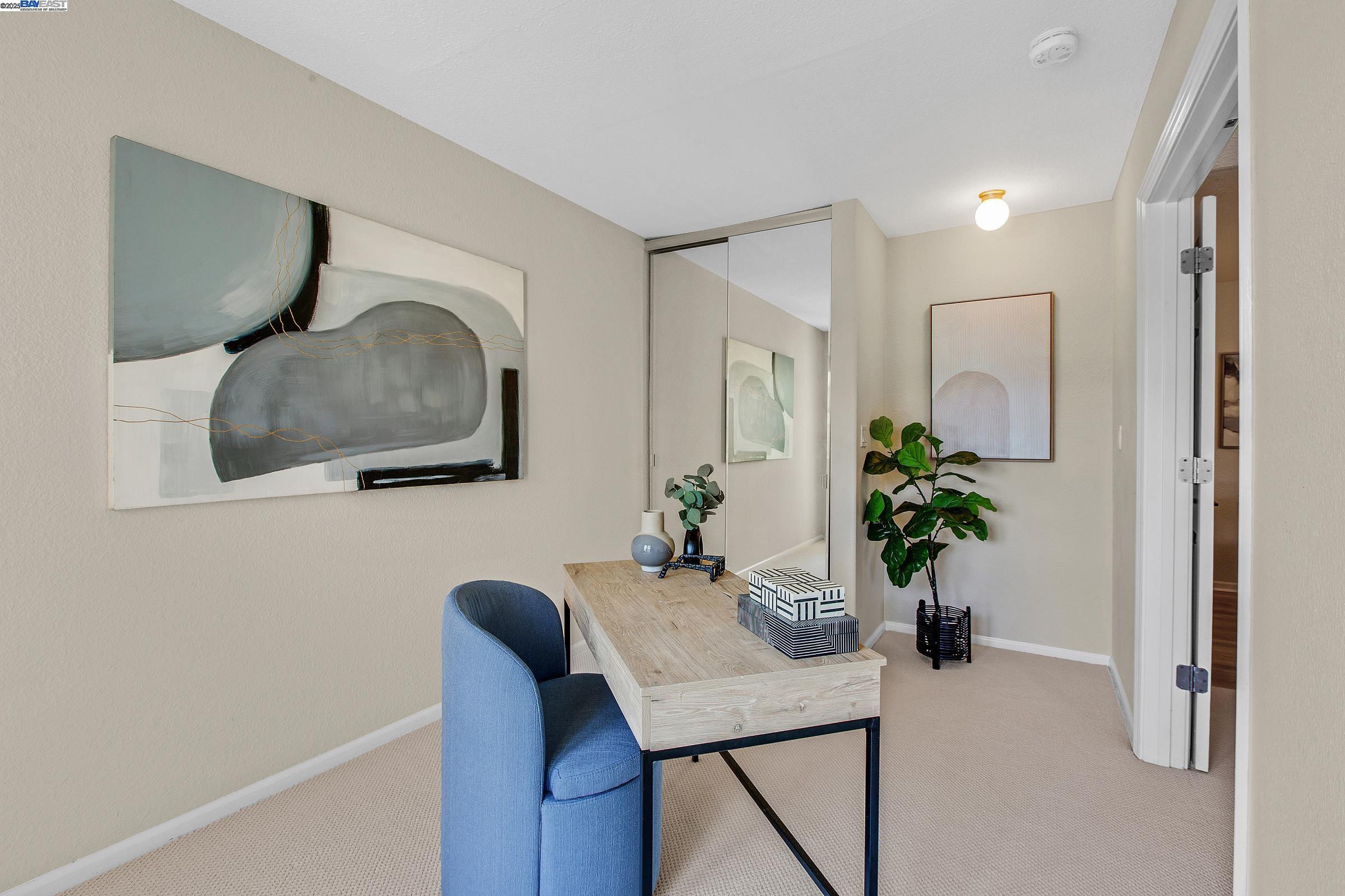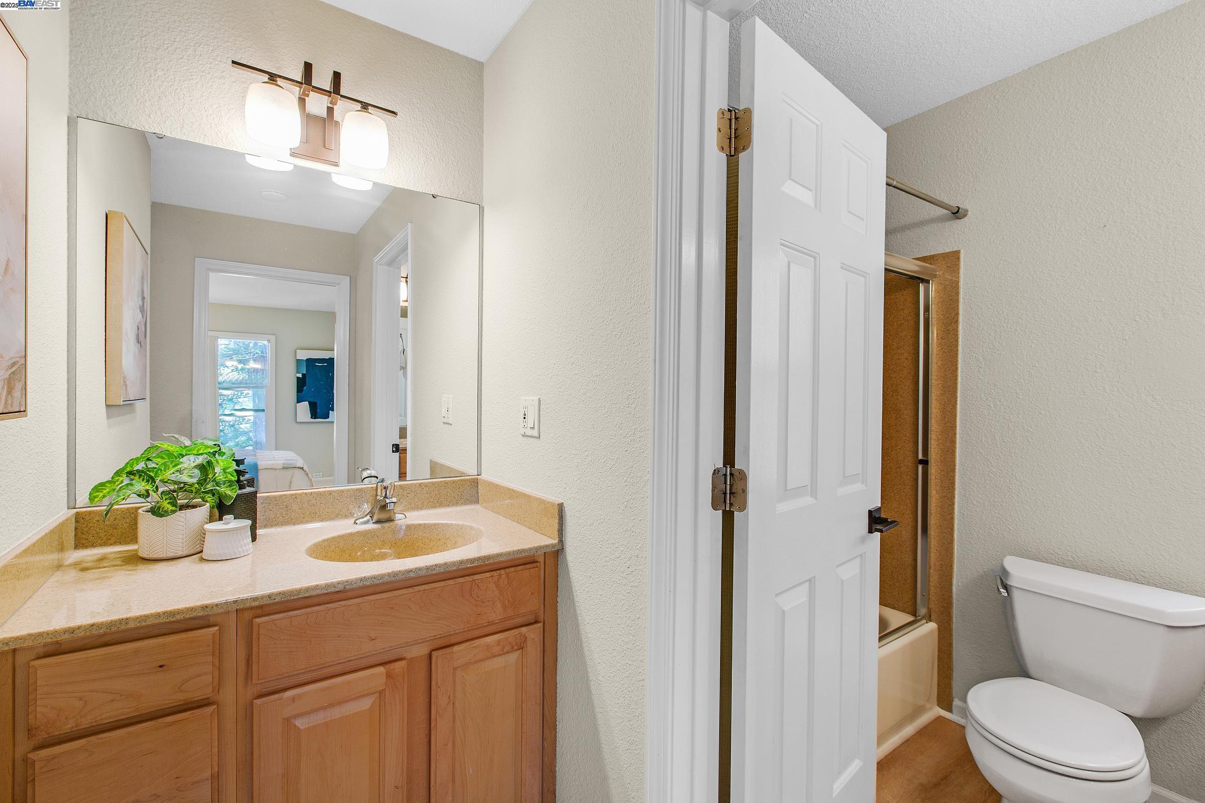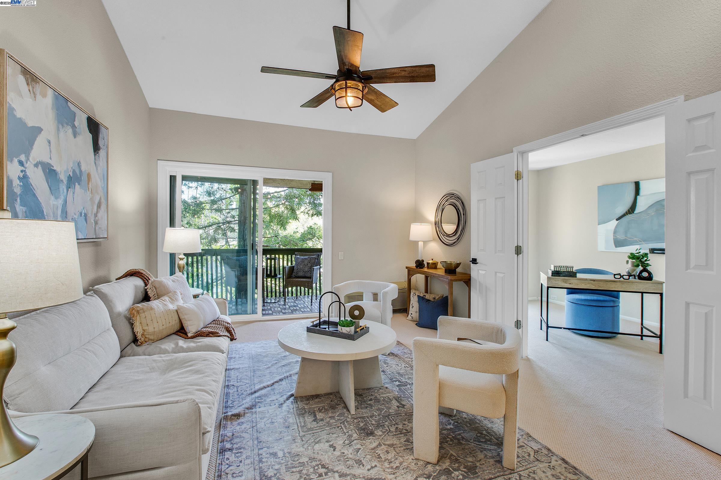 Welcome to this gorgeous, top-floor end unit in the heart of vibrant Walnut Creek! This beautifully updated condo with new flooring throughout offers the perfect blend of style, comfort, and convenience. Soaring vaulted ceilings, a skylight, and dual-pane windows fill the space with natural light, while modern touches like quartz countertops, brand new stainless steel appliances, and a brass dining light fixture with mouth-blown glass elevate the kitchen and living areas. A fingerprint touch lock and Nest Doorbell add an extra layer of modern security and ease. The spacious primary suite features double closets with floor-to-ceiling mirrored doors, and a stylish bathroom with dual vanities and a glass-enclosed shower over tub. Enjoy your private deck with views of Mt. Diablo, and take advantage of ample storage throughout the unit plus extra storage space above your covered parking spot. Additional features include a video intercom system and unbeatable walkability--just minutes to downtown with Broadway Plaza, upscale dining, shopping, movie theaters, and entertainment right outside your door. Enjoy direct access to the Iron Horse Trail, close proximity to BART, and more.